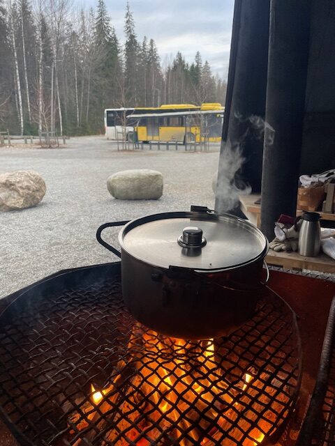 Perunoiden keittäminen on joutuisaa, kun niiden kuorimisen on hoitanut etukäteen. Aulangon ulkoilumajalle pääsee kaupungin linja-autolla, kuten kuvasta näkee.