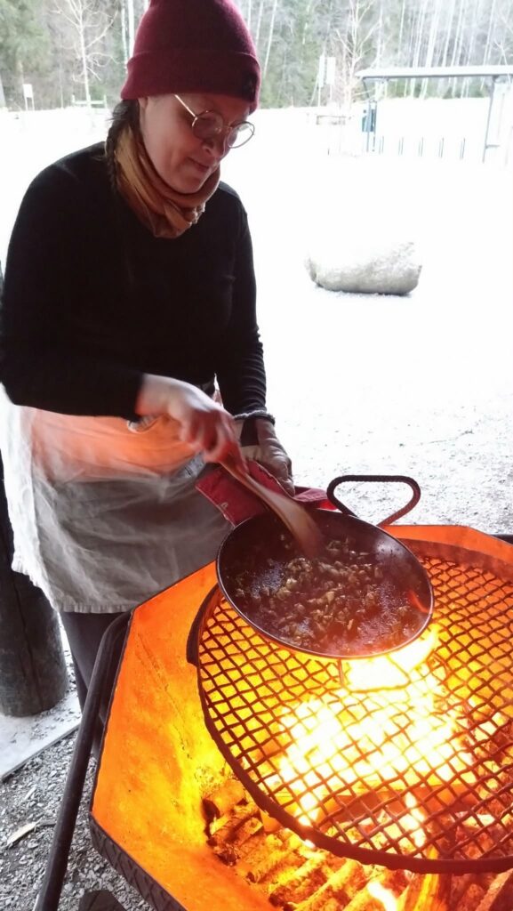 Outi Vinkki valmistaa trifolatia pannulla. Kodan tiivis tunnelma on imaissut kaikki illan värit. Kuva: Sanni Hallanvaara