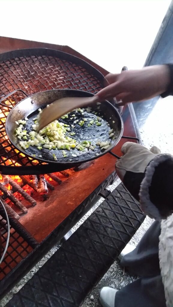 Pannulla paistaminen on nuotioruokailun kulmakiviä. Oliiviöljy tuo sipulien maut hyvin esiin. Kuva: Sanni Hallanvaara