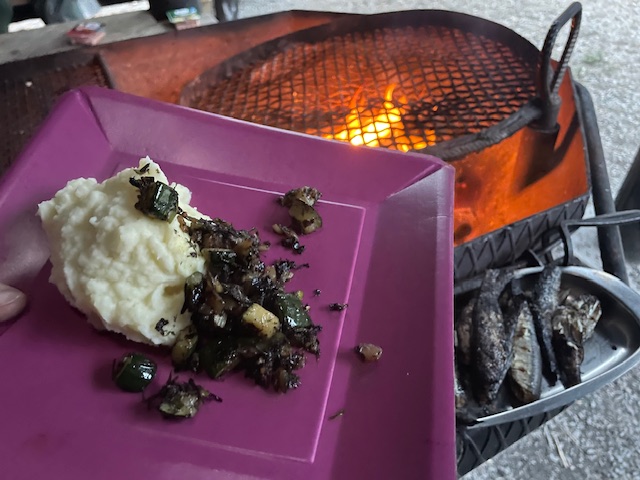 Muikkuja ystäväni valmisti kahdella tapaa: sinällään halstraten ja jauhotettuna voissa paistaen. Voissa paistetut ovat toki parempia, mutta halstraamalla saa pienet kalat kypsäksi vaivattomasti ja ilman lisättyä rasvaa. Kala on todellista retkiruokaa, vaikka raaka-aineen olisi hakenut supermarketin kalatiskiltä!